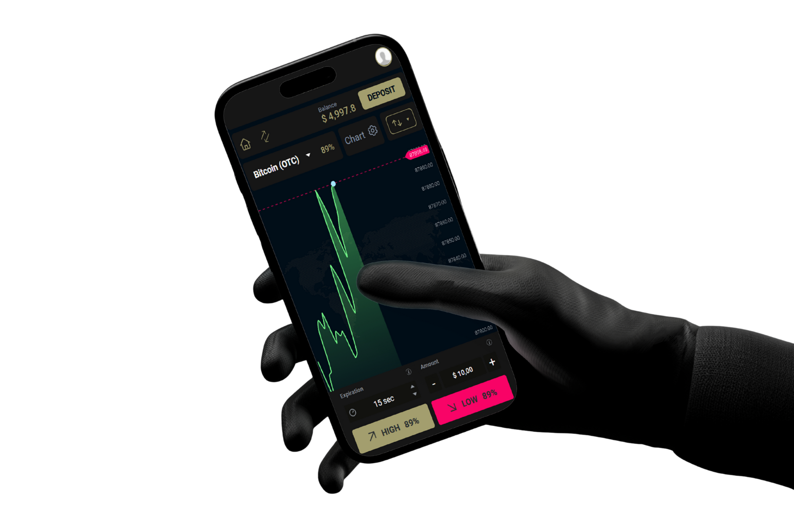 After signing up, select an asset, choose your trade amount, and predict whether the price will go up or down.